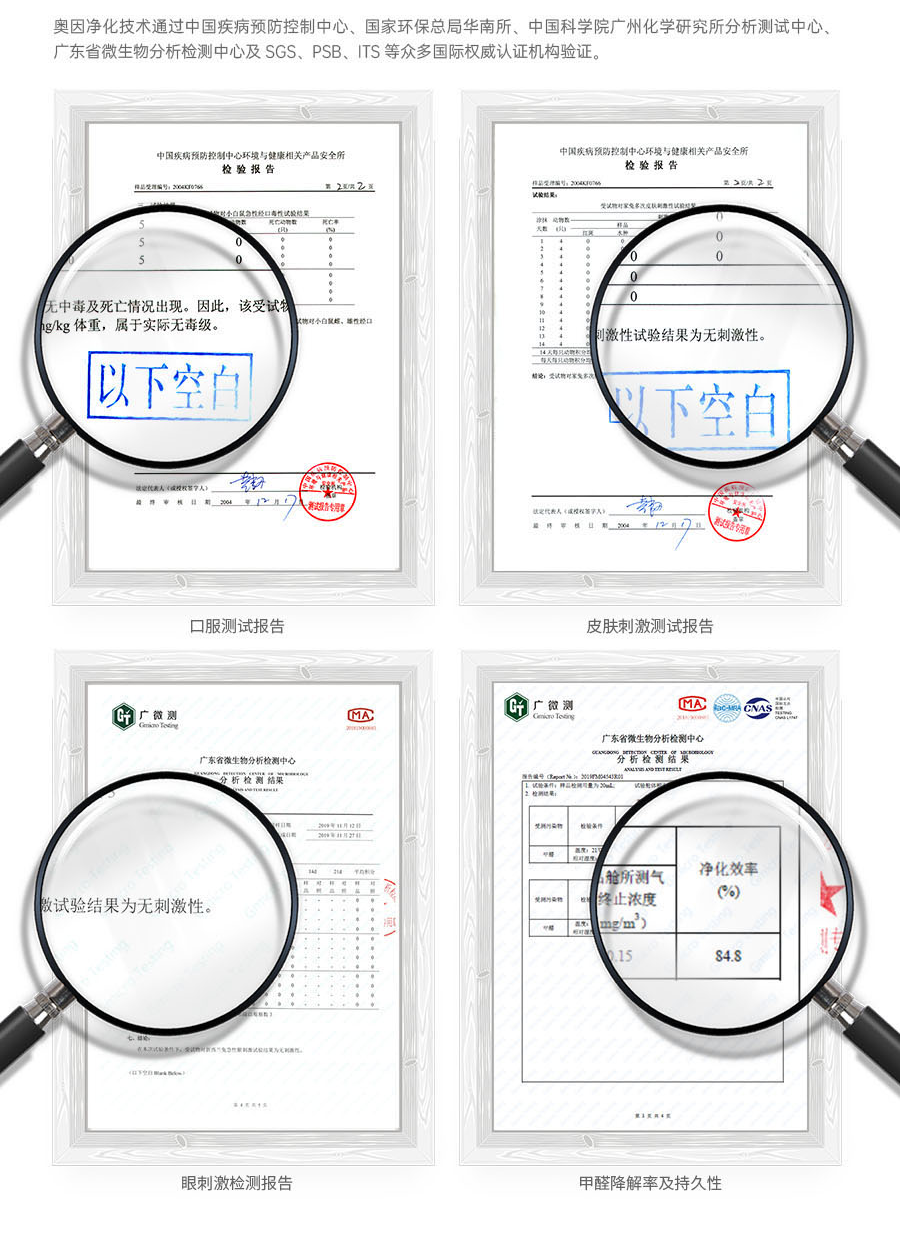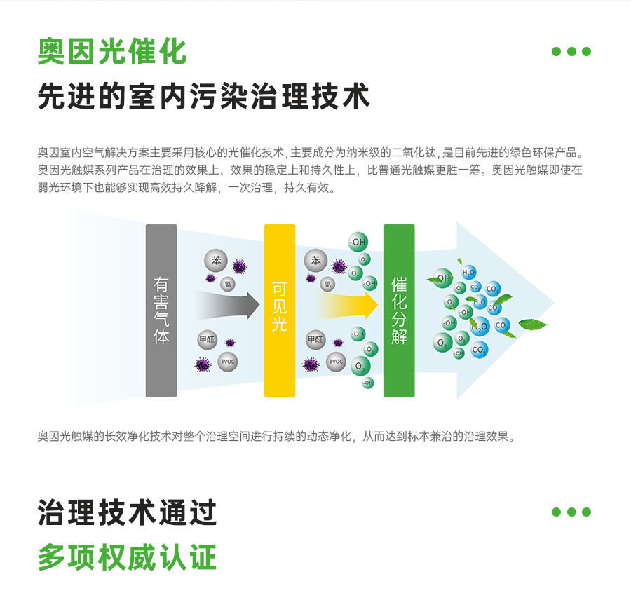 奧因光觸媒——裝修污染治理中的核心產(chǎn)品,國家863重點科技項目成果;擁有多項自主發(fā)明專利,噴涂在墻面、天花、家具表面、地毯等處,對甲醛、苯、氨、TVOC等有害氣體進(jìn)行長效治理。