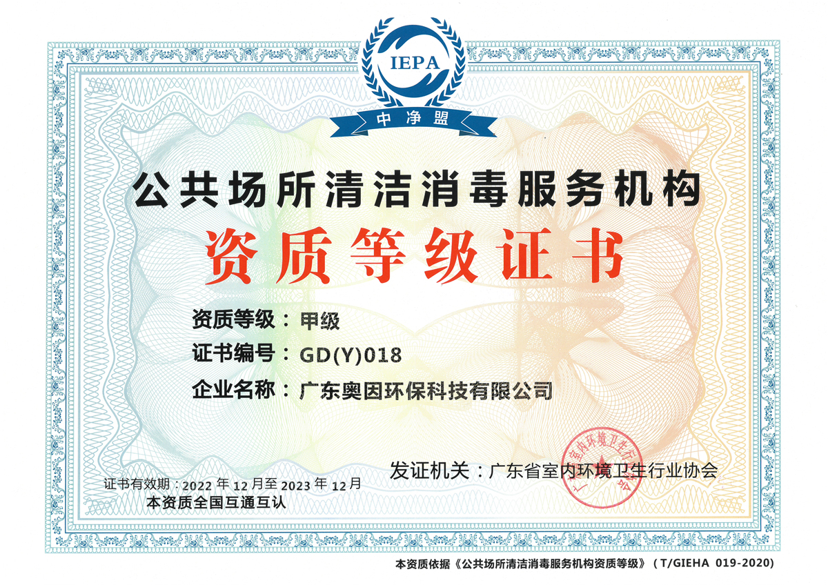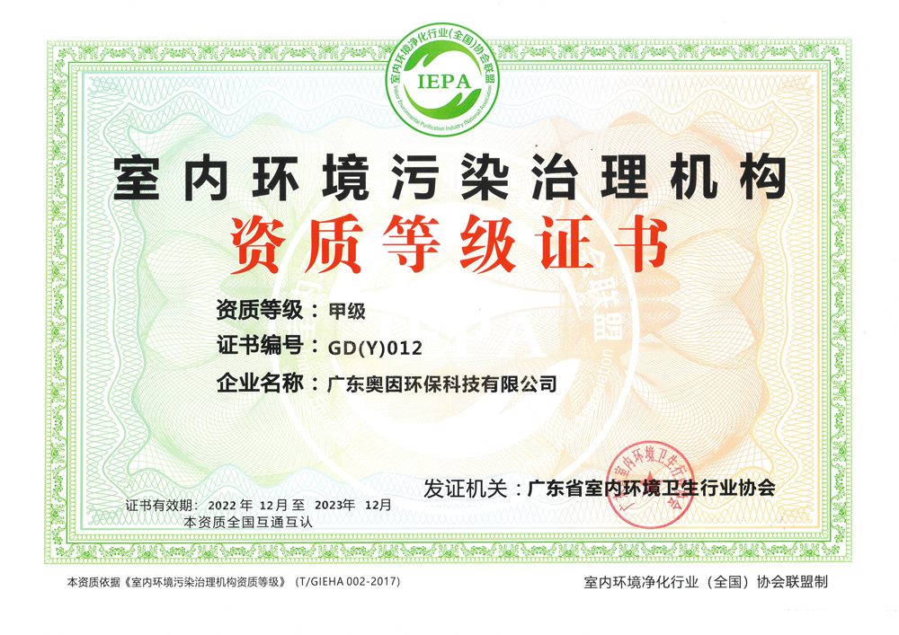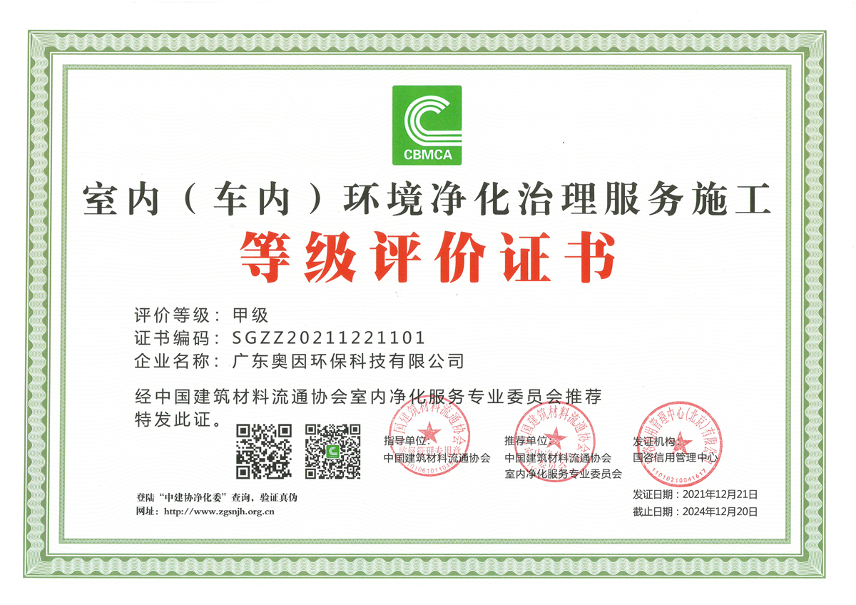 室內(車內)環(huán)境凈化治理服務施工甲級證書